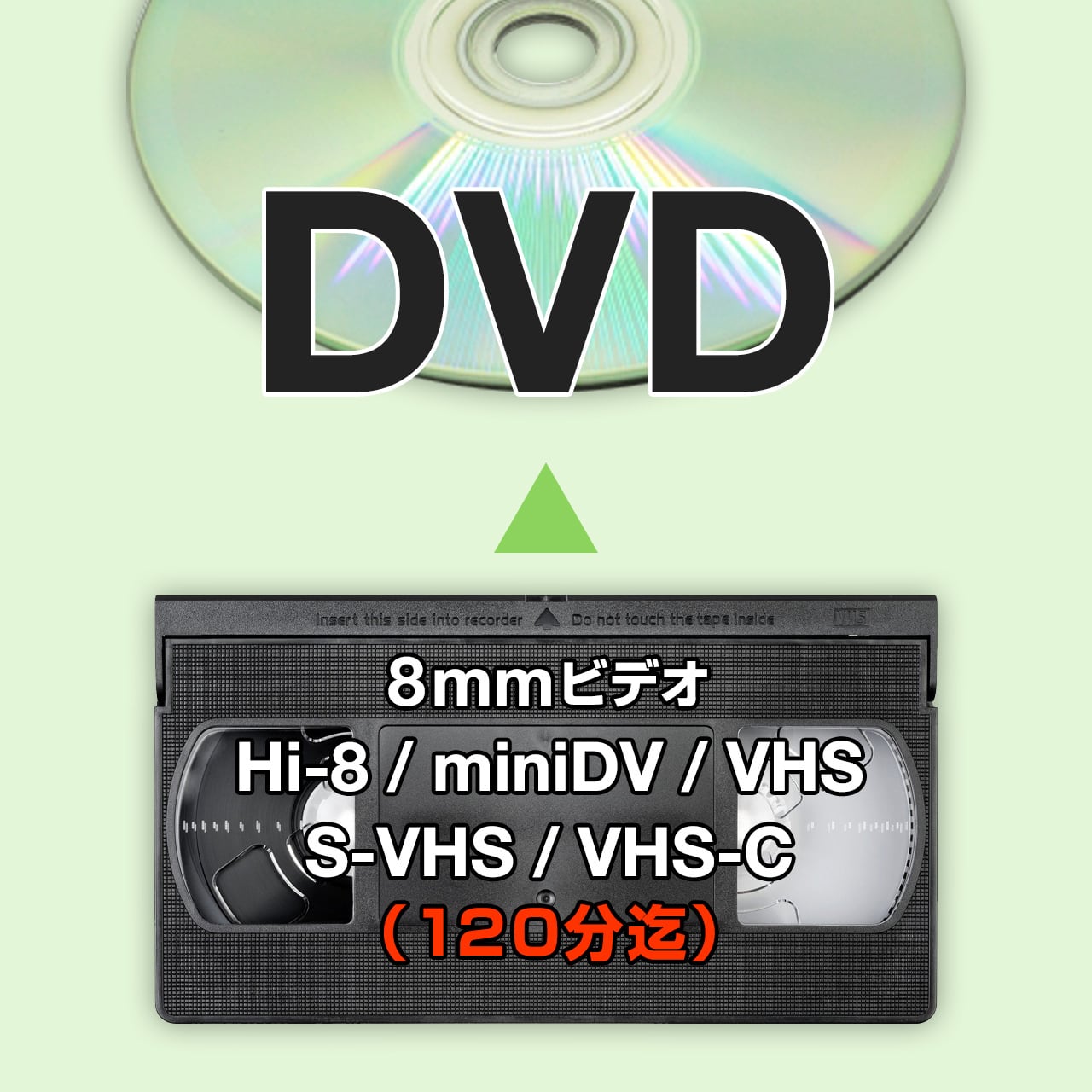 ビデオテープ1本(120分まで)からDVD1枚へダビング致します。お手持ちのビデオテープを変換してDVDに保存できます。懐かしい思い出・貴重な記録をもう一度、TVで楽しめます。